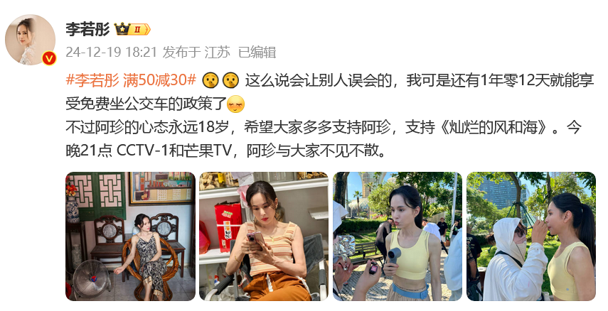 12月19日,李若彤发文回应“满50减30”的话题,称心态永远18岁。